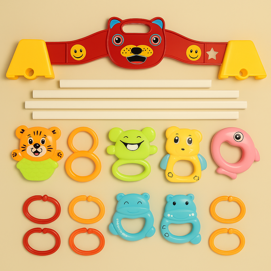 “Interactive Baby Play Gym for 2+ months – comes with removable rattle toys, sturdy stand, and a soft play area to support early learning and sensory development. Safe, durable, and easy to assemble for endless infant fun.”