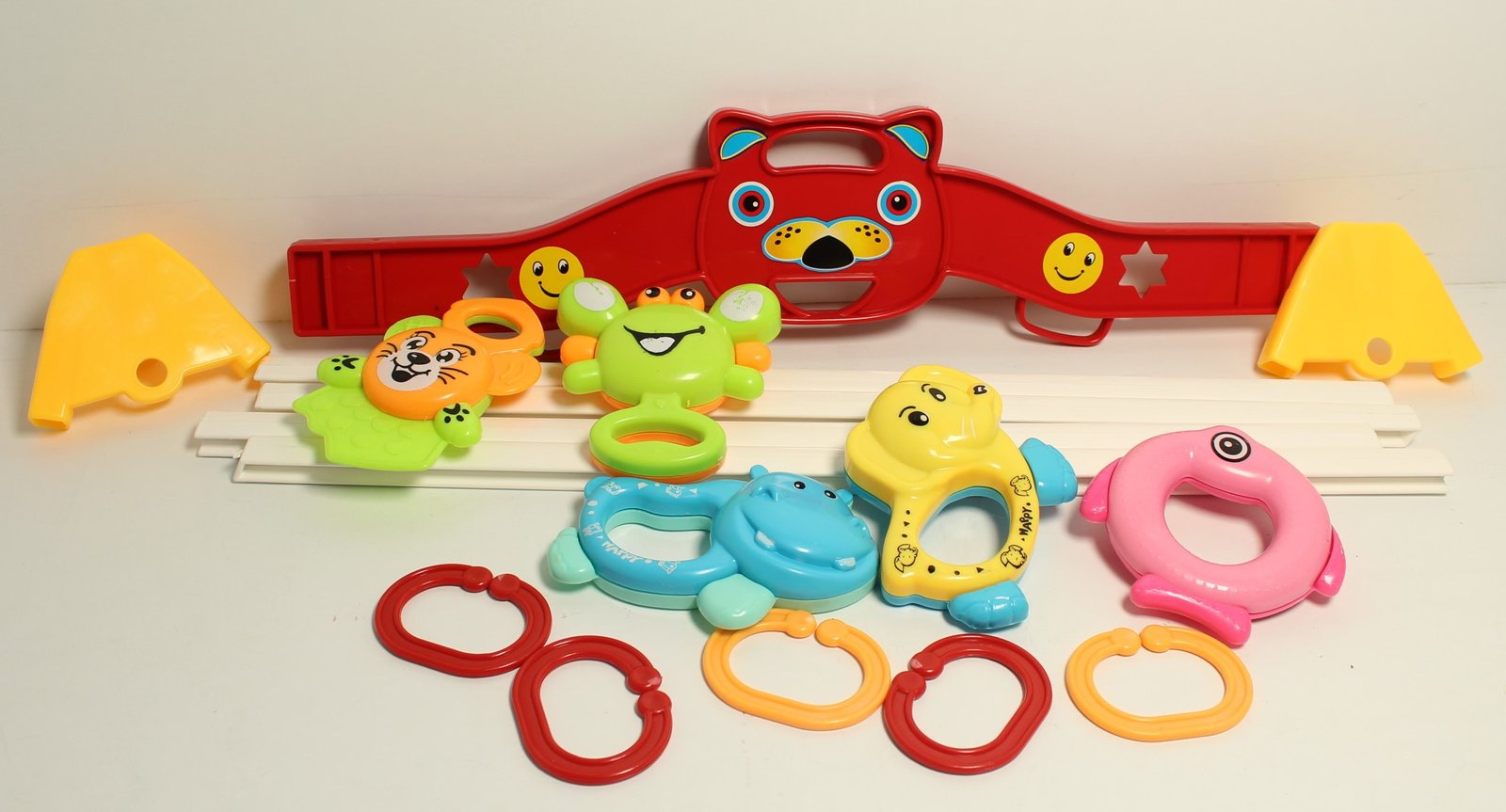 This Baby Play Gym, made especially for babies two months and above, will keep your baby occupied and active.  This play gym promotes reaching, grabbing, kicking, and visual development—all critical for early learning—with its durable plastic frame and detachable rattling toys.