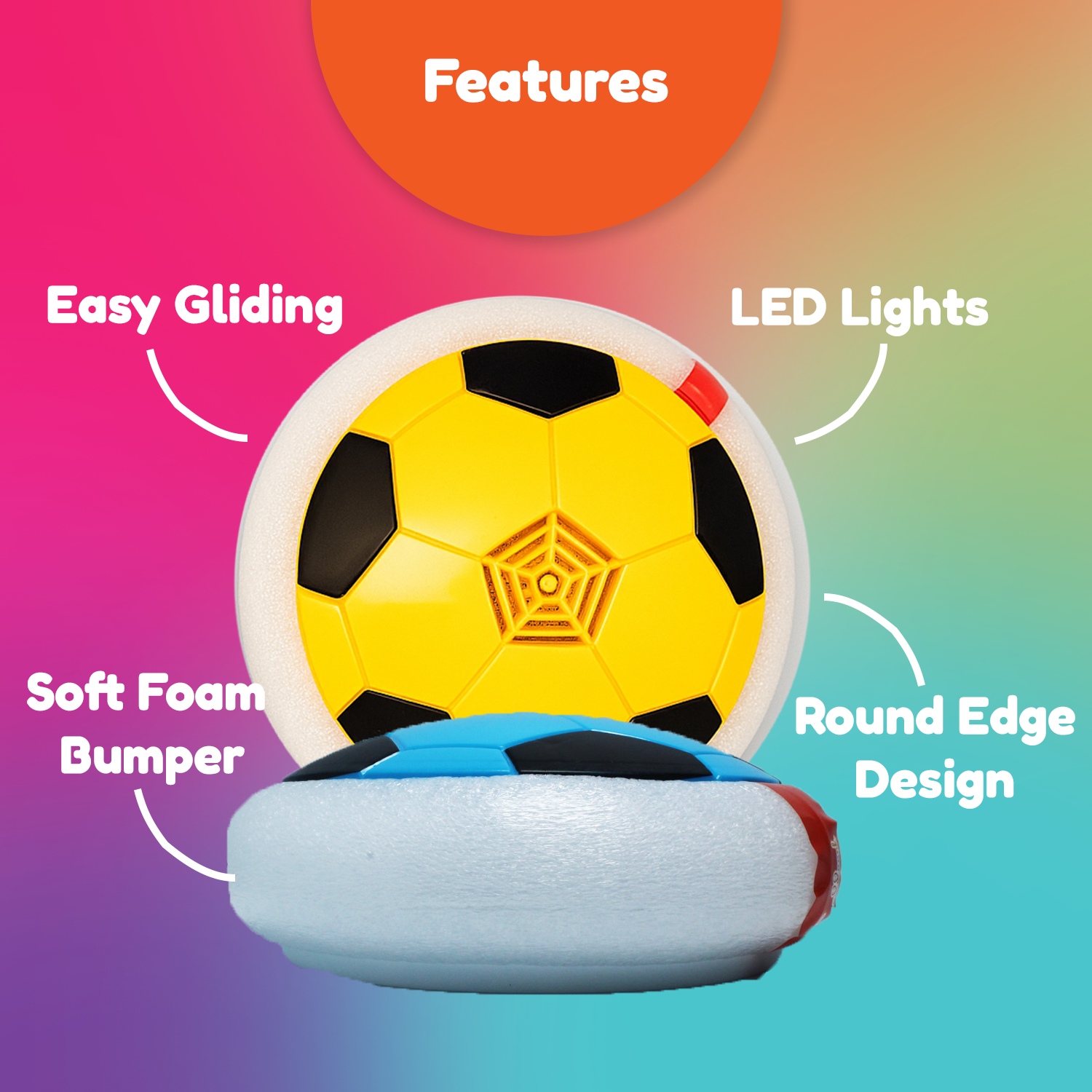 “Exciting Hover Football Toy with LED Lights – Glides smoothly on any flat surface, safe with soft foam edges, and perfect for indoor play. Keeps kids active, entertained, and engaged with glowing lights and endless fun!