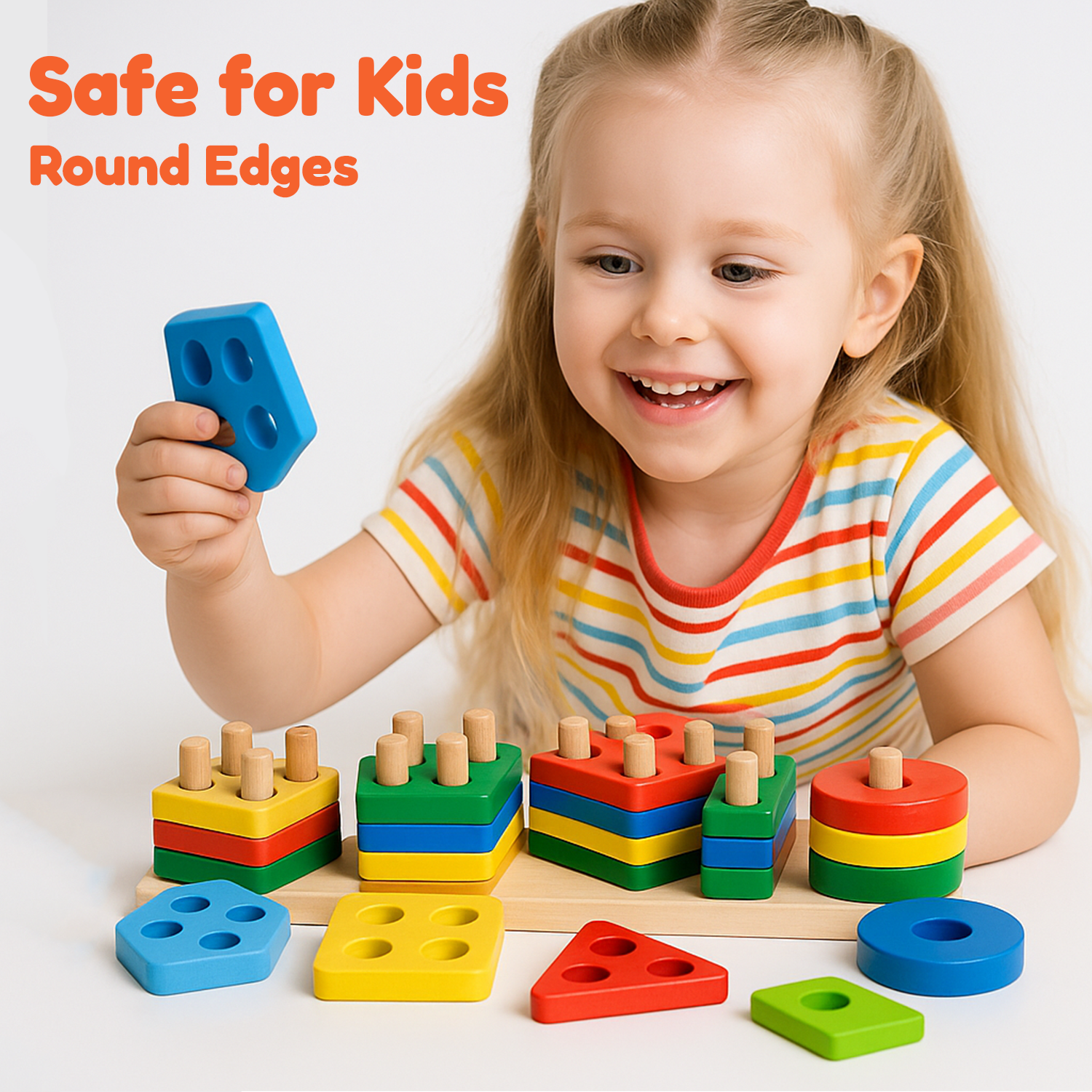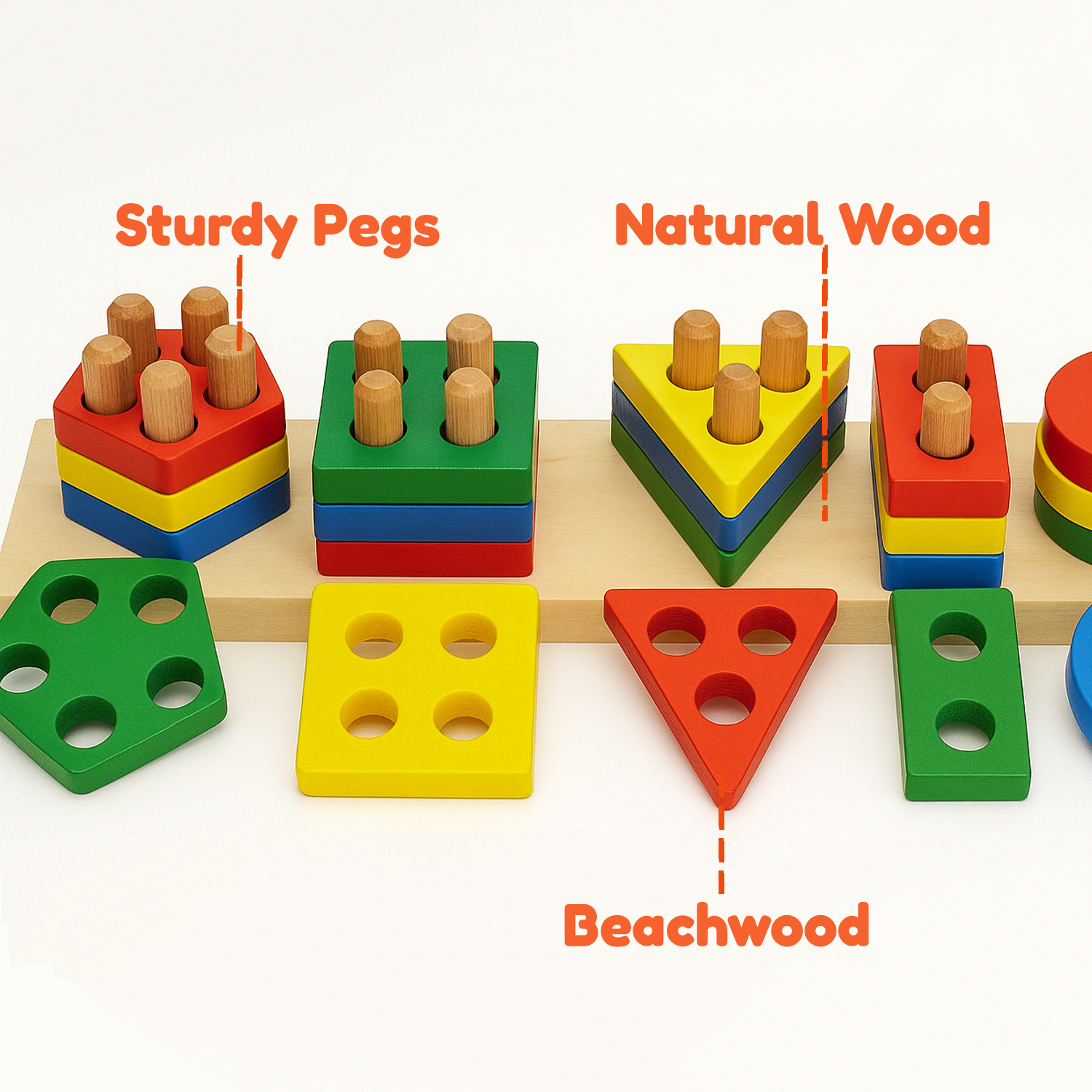 “Colourful Wooden Geometric Shape Sorting Toy – Safe, durable, and educational puzzle that helps toddlers learn shapes, colours, and stacking while enhancing motor skills and problem-solving ability.”