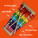 With this wooden xylophone musical toy, you may introduce your youngster to the enchanted realm of music. With its eight multicolored keys, this toy creates realistic, calming sounds that encourage infants to experiment with rhythm, melody, and creativity. It is made of high-quality wood and painted in non-toxic hues to guarantee longevity and safety. With two wooden mallets, a lightweight design, and smooth edges, children may play safely and comfortably. It enhances auditory perception, hand-eye coordination, and fine motor skills, making it ideal for early learning. An excellent option for preschools, gifts, or fun learning at home on a daily basis.